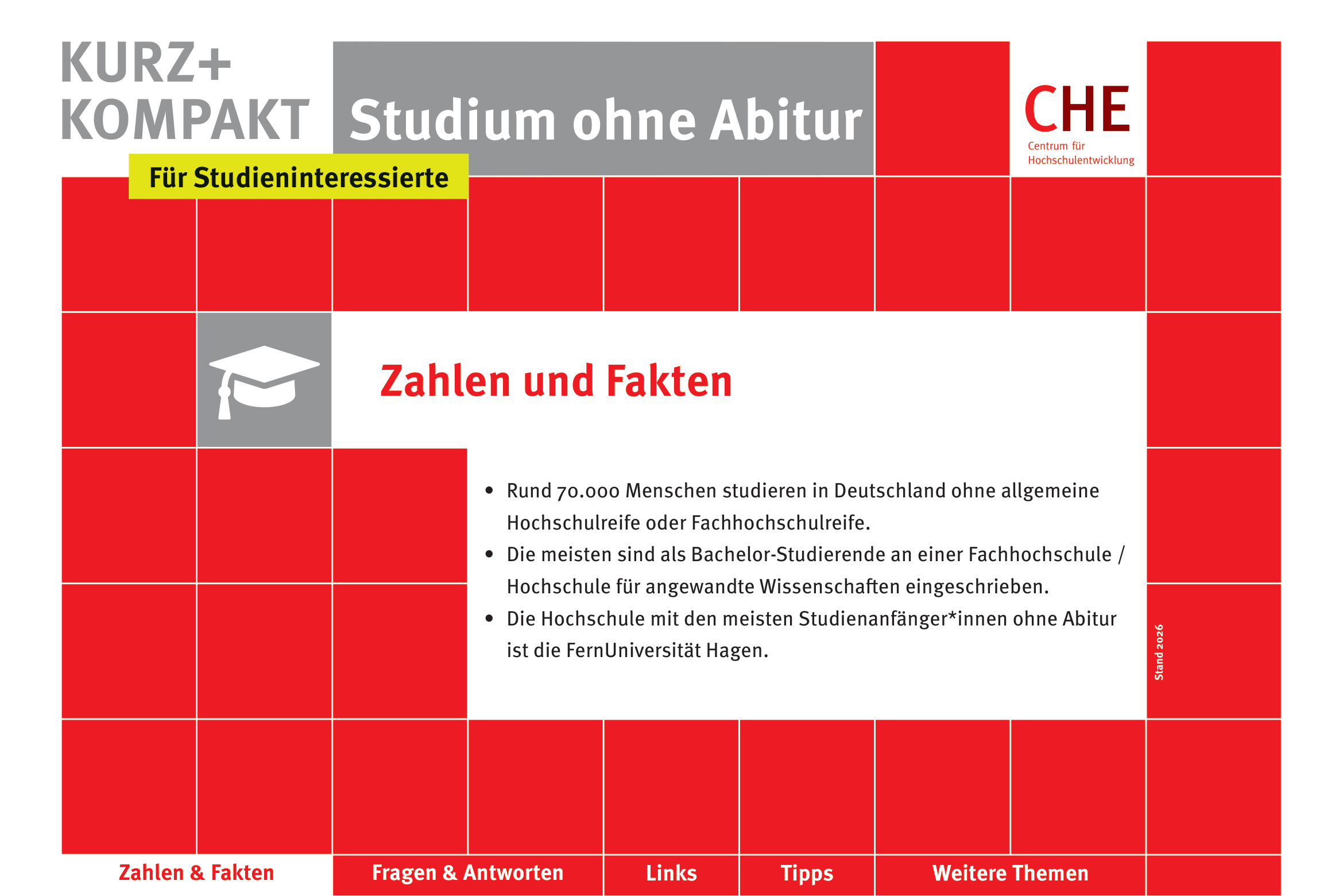 Die Reihe CHE kurz + kompakt bietet kompakte Informationen zu ausgewählten Themen. Auf wenigen Seiten finden sich Antworten auf die wichtigsten Fragen zum jeweiligen Thema und eine kommentierte Linkliste. Checklisten für nächste Schritte und weitere Recherchen runden das Infopaket im PDF-Format ab. Sämtliche Publikationen stehen kostenfrei als Download zur Verfügung.